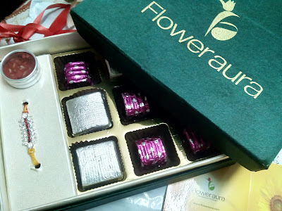 Here is the beauty that received from FlowerAura "The Sweetest Blessings " is the name of this Beauty .This Box of delight comprises of an ornate rakhi along with a box of tikka to complete the tradition . With this it also has delicious handmade chocolates to relish .This combination of Rakhi and Chocolates is a symbol of the strong bonding and your sweet love .Floweraura Signature Box